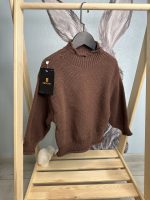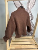детский вязаный свитер темно-коричневого, шоколадного цвета, выполненный в стиле оверсайз. Эта модель отличается свободным кроем и высоким воротником-стойкой.