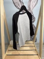 Представленный товар — это детский лонгслив (футболка с длинным рукавом) в стиле реглан. Модель выполнена в сером цвете с контрастными черными рукавами.