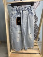 Детские джинсы с необработанным (рваным) краем — это модная одежда, обычно выполненная из хлопкового денима с добавлением эластана, характерной особенностью которой является наличие искусственно состаренных элементов: дырок, потертостей или неаккуратного среза по нижнему краю штанин.