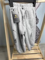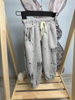 Серые детские штаны на изображении — это трикотажные джоггеры свободного кроя с современным абстрактным принтом.
