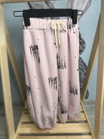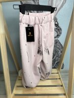• Цвет и принт: Основной цвет изделия — нежно-розовый. По всей поверхности нанесен абстрактный принт в виде черных вертикальных мазков и брызг, что придает штанам современный и динамичный вид.